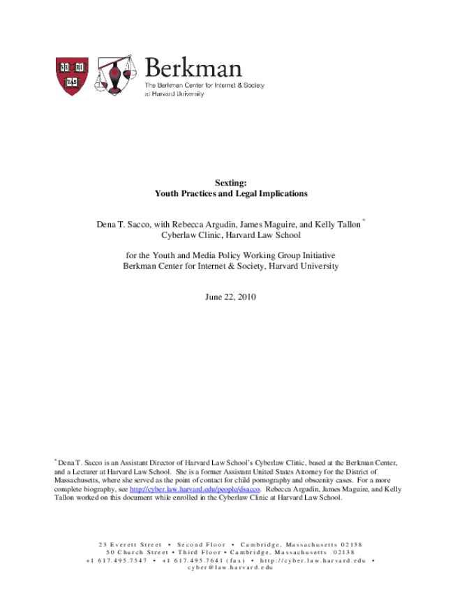 This document addresses legal and practical issues related to the practice colloquially known as sexting. It was created by Harvard Law School’s Cyberlaw Clinic, based at the Berkman Center for Internet & Society, for the Berkman Center’s Youth and Media Policy Working Group Initiative.1 The Initiative is exploring policy issues that fall within three substantive clusters emerging from youth’s information and communications technology practices: Risky Behaviors and Online Safety; Privacy, Publicity and Reputation; and Youth Created Content and Information Quality. The Initiative is funded by the John D. and Catherine T. MacArthur Foundation and is co‐directed by danah boyd, Urs Gasser, and John Palfrey. This document was created for the Risky Behaviors and Online Safety cluster, which is focused on four core issues: (1) sexual solicitation and problematic sexual encounters; (2) Internet‐related bullying and harassment; (3) access to problematic content, including pornography and self‐harm content; and (4) youth‐generated problematic content, including sexting. The Initiative’s goal is to bring the best research on youth and media into the policy‐making debate and to propose practical interventions based upon that research.